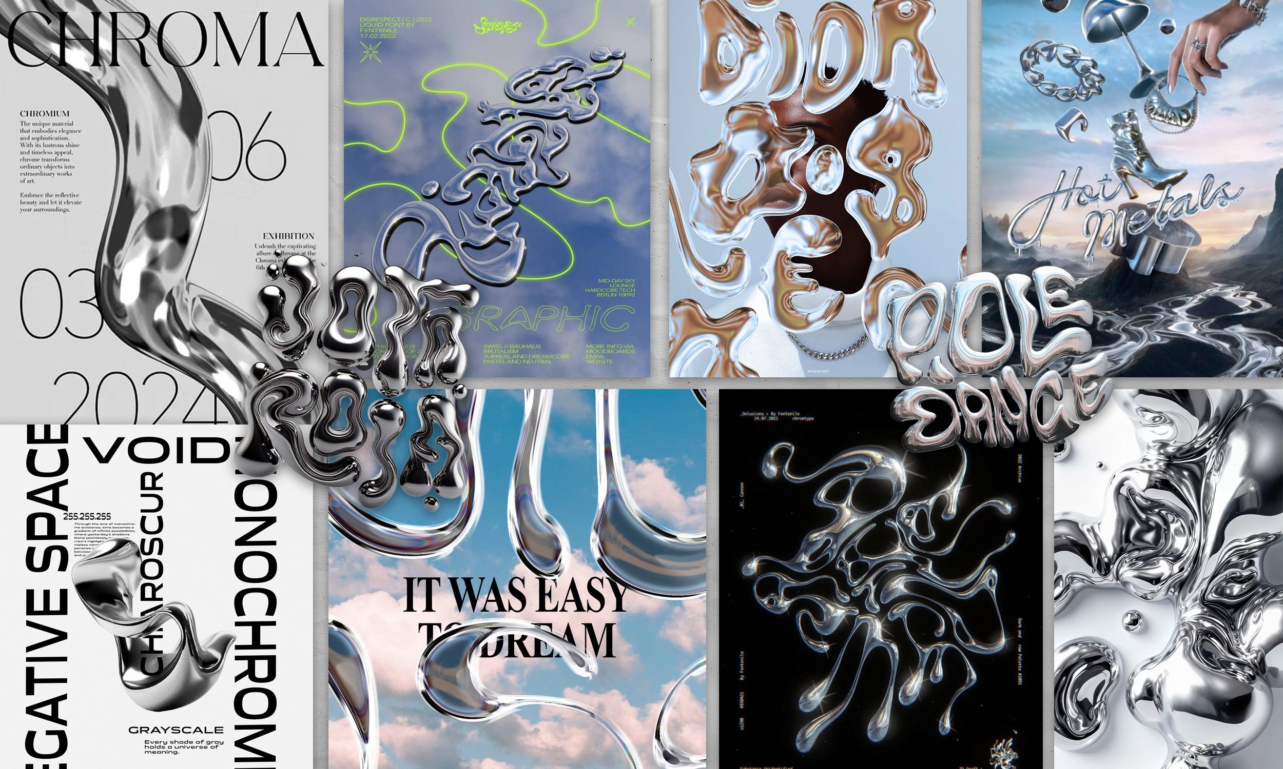 Cette esthétique tire son inspiration des expérimentations en 3D, des rendus métalliques et des effets de liquide dans le design numérique et l’animation. Popularisée par les interfaces futuristes, le branding high-tech et l’art numérique, la tendance Liquid & Chrome fluide réinvente les visuels en leur donnant une dimension organique et hyperréaliste, où la lumière et la matière jouent un rôle central.